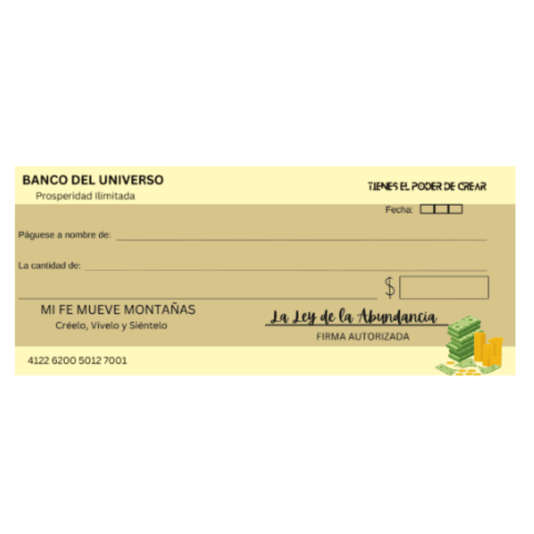 Herramienta imprescindible para manifestar dinero. Simula un cheque vibracional para reforzar tu intención de abundancia.